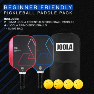 The Dash Pickleball Paddle Pack includes (2) 12mm JOOLA Essential paddles, upgraded with Cool Press layering to deliver a beginner-friendly paddle that feels pro from the first swing. The Essential shape features a refreshed two-color gradient design and a sandblasted surface that adds extra grit for improved control and touch. The set also comes with (4) JOOLA Primo Balls, engineered for consistent bounce and reliable play in any setting. A convenient over-the-shoulder sling bag rounds out the pack, making it easy to carry your paddles, balls, and essentials wherever you go. Grab a friend and head to the nearest court; the next match is waiting.