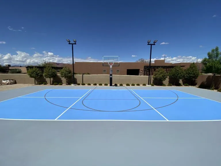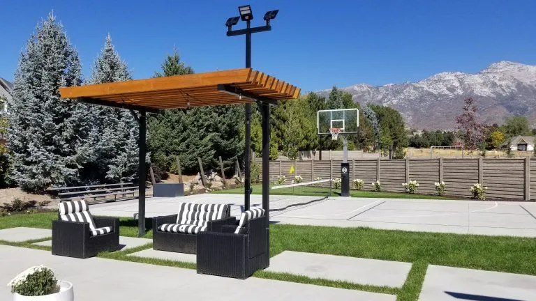 Our 150 Watt LED light has been designed to be the ultimate driveway or backyard court light. Each light fixture is coated with a black anodized finish which makes your driveway or court look professional while also preventing corrosion and color fading. The total lumen output is 19,500 lm and the efficacy is 130 lm/W (lumins per Watt). A single light fixture will provide your court with roughly a 30′ x 30′ area of coverage.