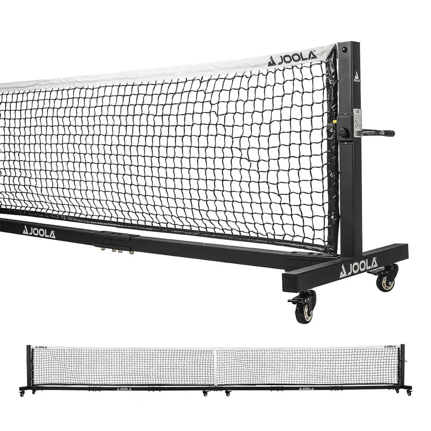 The JOOLA Pro Pickleball Net (C) is a portable net that plays like it was cemented in the ground. The thick steel frame makes it a favorite at rec centers and sports clubs for its ability to easily convert tennis courts to pickleball courts. 6 caster wheels allow it to roll from indoor gyms to outdoor courts. Standard length of 22ft to reach the recommended 12in beyond the pickleball court lines on each side. Heavy gauge steel cable tensioning system uses a hand crank to reach the regulation 36in height at the sides while the center strap ensures the middle reaches the 34in mark. Top vinyl strip maintains durability, but also provides the playability pickleball players expect at tournaments and top tier clubs. Powder-coated frame can withstand mother nature and endless hours of open play.