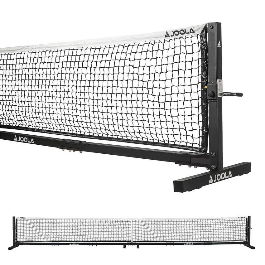 The JOOLA Pro Pickleball Net S is a semi-permanent, heavy-duty pickleball net ideal for racket clubs and backyard courts alike. Large, 60mm, black powder coated steel frames and legs allows the net to play similar to an inground pickleball net. This effect is doubled with the heavy gauge steel cable tensioning system. Using the hand crank, the system makes it quick and easy to get the regulation 36” height at the sides while the center strap ensures the middle reaches the 34” mark. The top vinyl strip maintains durability but also provides the playability pickleball players expect at tournaments and top tier clubs. Rubber pads protect the court surface under each of the legs. If you’re looking for a portable pickleball net, check out the JOOLA Pro Pickleball Net C for the version with caster wheels.