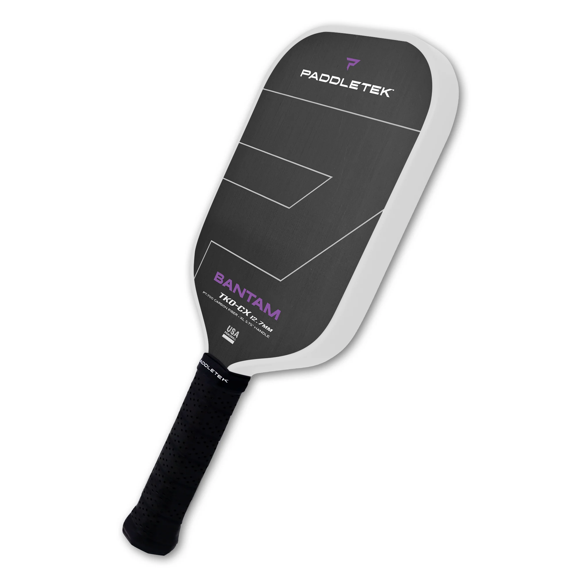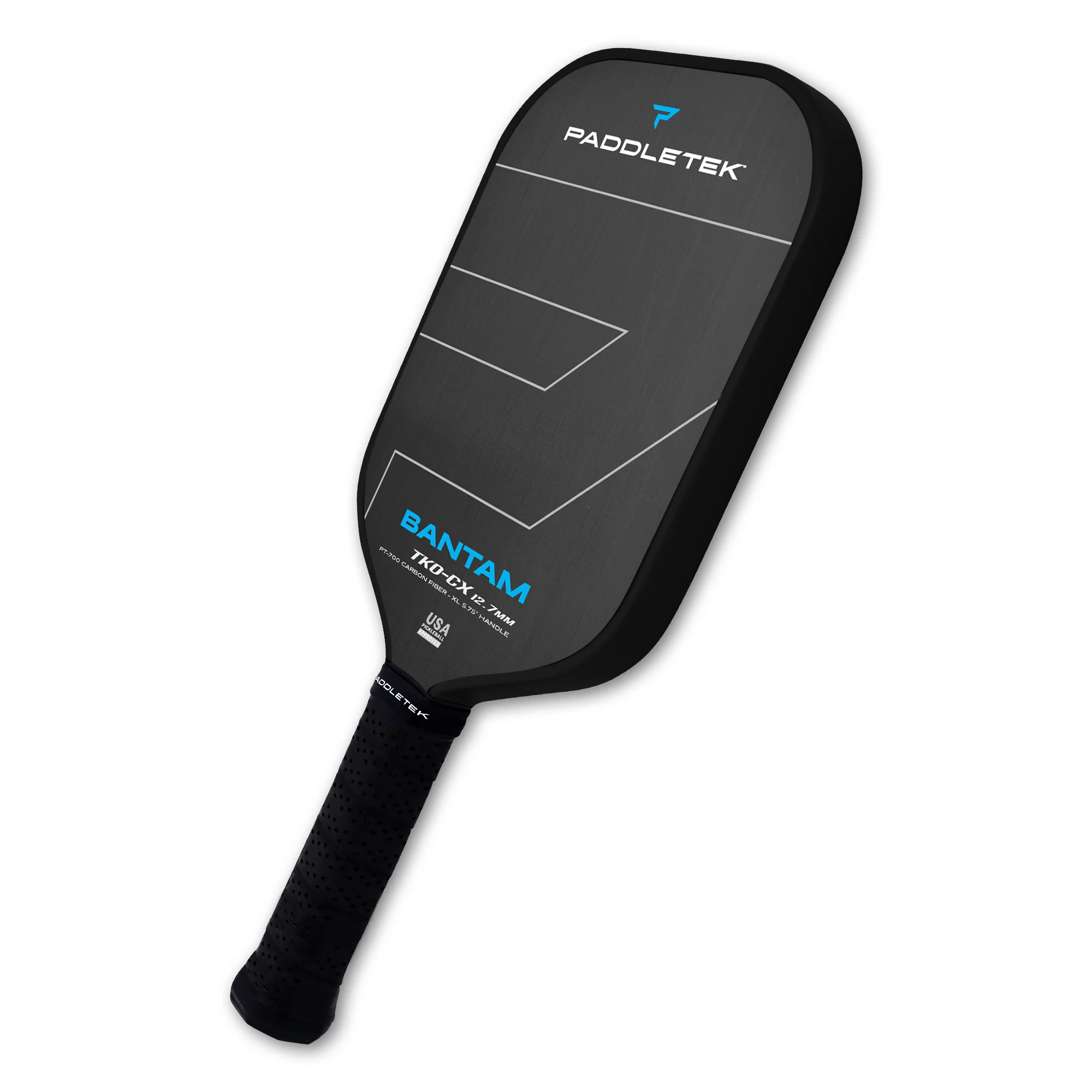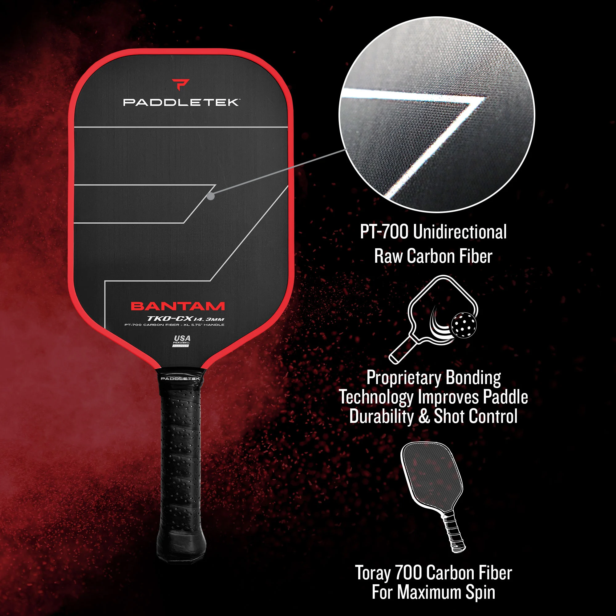 The Bantam TKO-CX (XL handle) was designed in conjunction with top pickleball pro, Christian Alshon, to provide a combination of power, spin, and reach. PT-700 unidirectional RAW carbon fiber is combined with our legendary 12.7mm Bantam core to give serious players max power and spin capability or our more forgiving 14.3mm Bantam core to give serious players controllable power and spin capability. A 5 3⁄4” handle reduces wind drag and allows for a two-handed backhand, while a 16 1⁄2 ” overall paddle length increases speed at the point of contact—exponentially increasing power with every hit.